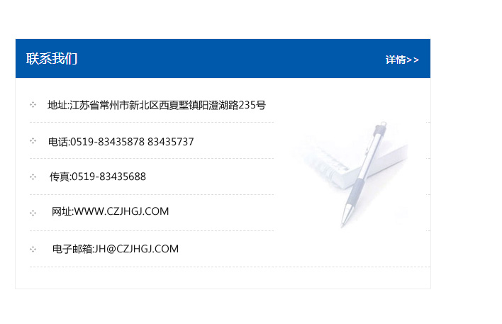 地址:常州市新北區友邦商務大廈1幢16、17層  電話:0519-85101652  傳真:0519-85112595  郵編:213022  網址:www.cz-jiayue_cn.hhxd168.com  郵箱:xiajifengaa@163.com